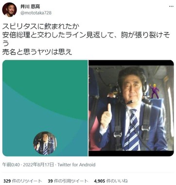 井川氏は8月17日深夜、「スピリタスに飲まれたか 安倍総理と交わしたライン見返して、胸が張り裂けそう 売名と思うヤツは思え」として、安倍元首相のものとみられるLINEのプロフィール画面を添付しツイートした。