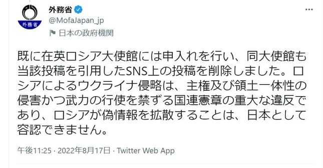 外務省も17日、在英ロシア大使館に申入れをしたとツイッターで報告し、「ロシアによるウクライナ侵略は、主権及び領土一体性の侵害かつ武力の行使を禁ずる国連憲章の重大な違反であり、ロシアが偽情報を拡散することは、日本として容認できません」と非難した。