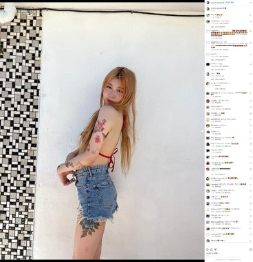 ペクさんはハートの絵文字と共に、ビキニとショートパンツを着た自身の写真を複数枚公開した。太もも、腕、お腹などに数々のタトゥーが入っているのが見える。カラフルな花などのデザインが施されている。