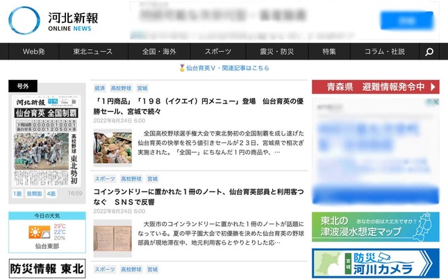 今夏の甲子園で、仙台育英は春夏通じて東北勢初めての優勝を飾った。優勝後には、号外を求め仙台駅前に集まる人の姿がツイッターなどで拡散されていた。フリマアプリでは、号外や優勝翌日の河北新報の朝刊が高額で出品されるケースもみられる。