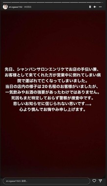 エンリケさんは7月初旬、インスタグラムのストーリーズで「先日、シャンパンサロンエンリケでお店の手伝い兼、お客様として来てくれた方が営業中に倒れてしまい病院に運ばれて亡くなってしまいました。当日の店内の様子は20名程のお客様がいましたが、一気飲みやお酒の強要があったわけではありません。死因もまだ特定しておらず警察が捜査中です。悲しいお知らせに信じられない思いです...。心より慎んでお悔やみ申し上げます」と報告している。