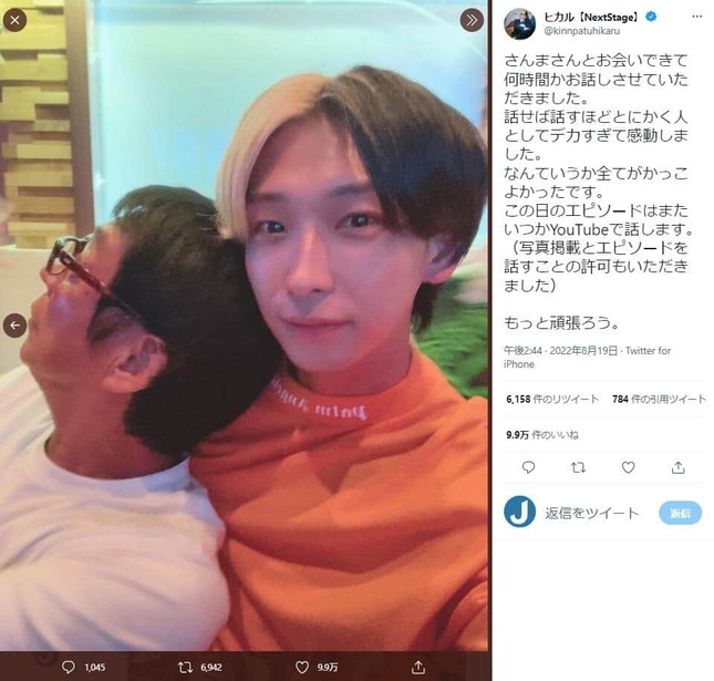 ヒカルさんは2022年8月19日、さんまさんとのツーショット写真とともに「さんまさんとお会いできて何時間かお話しさせていただきました」とツイートし、大きな話題となった。
