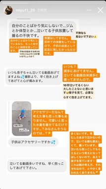 「自分のことばかり気にしないで...ジムとか体型とか...泣いてる子供放置して撮るの不快です」とするコメントには、「不快なら見ないで下さい」とバッサリ。そのうえで、