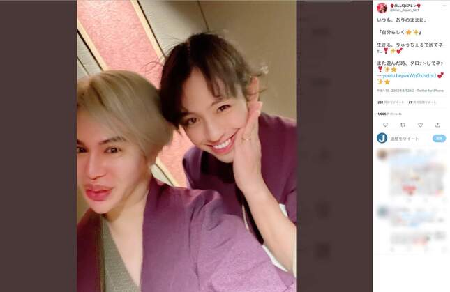 アレンさんは26日、ツイッターでryuchellさんとの2ショット写真を投稿。夫婦関係解消を発表したryuchellさんに「いつも、ありのままに、『自分らしく』生きる、りゅうちぇるで居てネッ」と、星の絵文字付きでエールを送った。