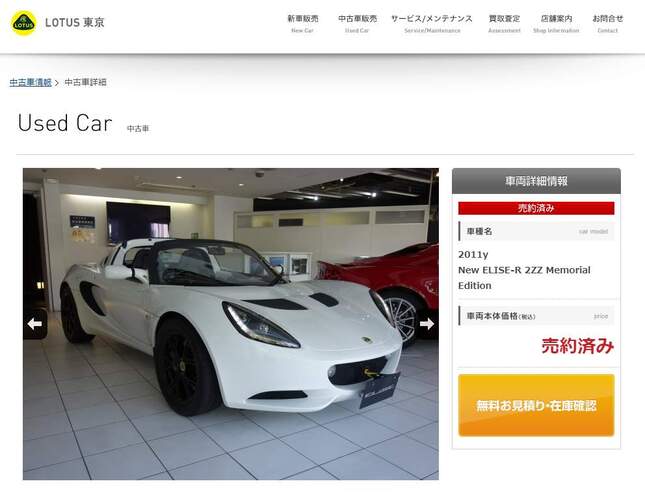 ツイッターで8月25日、自動車販売店「LOTUS 東京」公式サイトで、上記のエリーゼRが中古車として販売されているページをスクリーンショットして紹介する投稿があった。