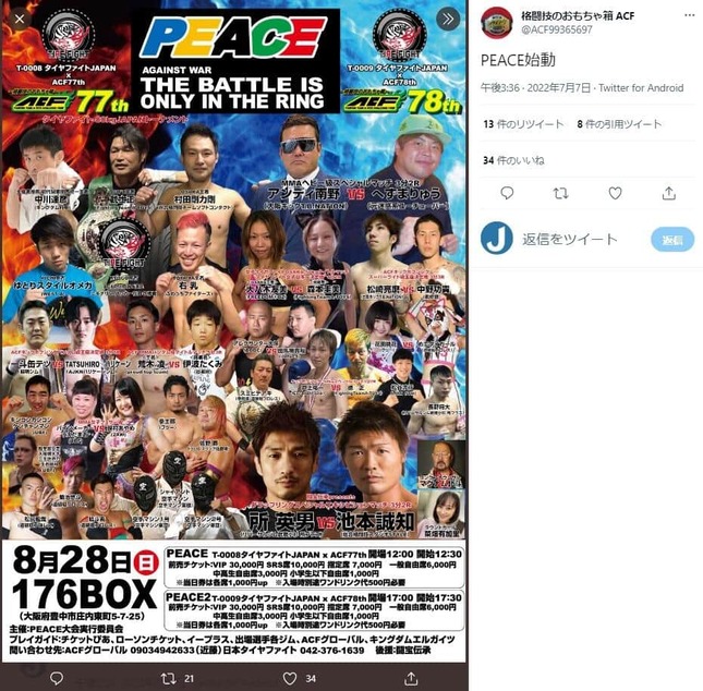へずまさんをめぐっては、28日に大阪で開催された格闘技イベント「PEACE 2」で、格闘家・アンディ南野さんとの対戦が告知されていた。大会運営が24日、YouTubeに投稿していた予告動画では、アンディさんを「大阪の伝説の格闘家、アンディ伝説復活」などと紹介している。ところが27日、運営はへずまさんが「熱中症による体調不良」のため欠場するとツイッターで知らせた。