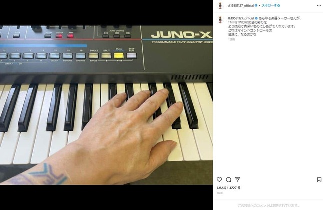 小室さんが「あらゆる楽器メーカーさんが、TM NETWORKの音の彩りを より繊細で奥深いものにしあげてくれています。これはマインドコントロールの 音源に、なるのかな」のコメントとともに公開したのは、キーボードを弾く手元の写真だ。