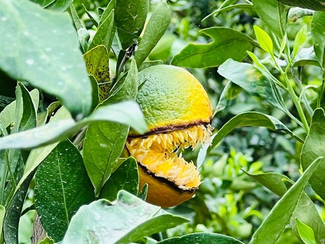 「こちら愛媛のオリジナル品種『甘平』です。高級柑橘です。外皮が薄く、実がパンパンに詰まっているのですが、雨が降ったあと木が地面から水分を吸い上げることで急激に実が膨張し、耐え切れなくなった外皮が裂けてしまいます。ここ2日よく雨が降りました」