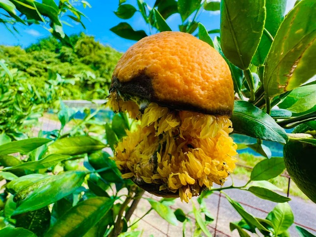 「めちゃめちゃこわいみかんいた」――愛媛県今治市の「のま果樹園」で発見されたミカンに大きな注目が集まっている。ミカンの真ん中がぱっくりと裂け、果肉が牙のようにむき出しになっているのだ。