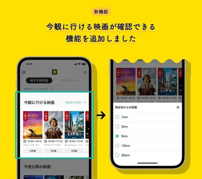 Filmarksは8月5日から、新機能「今観に行ける映画」を導入した。位置情報の利用許可をし、現在地からの任意の距離(1キロ、3キロ、5キロ、10キロ、30キロ)を選ぶと、まもなく始まる上映作品が一覧で表示される。