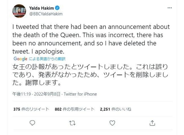 その後、15時19分に「I tweeted that there had been an announcement about the death of the Queen. This was incorrect, there has been no announcement, and so I have deleted the tweet. I apologise.(女王の訃報があったと投稿しましたが、これは誤りであり、発表はなかったためツイートを削除しました。申し訳ありませんでした)」とツイッターで謝罪した。