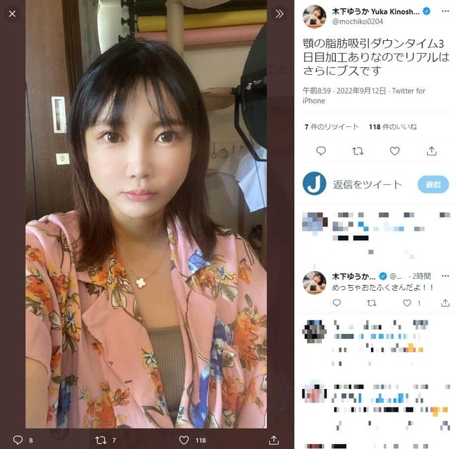 そんな木下さんはツイッターで「顎の脂肪吸引ダウンタイム3日目」とつづり、自撮り写真を公開。普段と比べ、顔がむくんでいる様子の木下さんが写っていた。写真は「加工あり」で「リアルはさらにブスです」とつづり、リプライで「めっちゃおたふくさんだよ!!」と自虐気味にコメントしていた。
