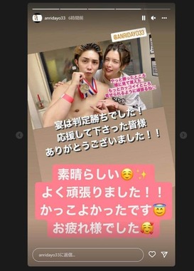 進一さんは試合前にインスタグラムのストーリーズで「嫁と皇治コーデ」とつづり、坂口さんとお揃いのコーデで会場入りしたことを報告。試合に勝利したあとに再びストーリーズを更新し、「宴は判定勝ちでした! 応援して下さった皆様ありがとうございました!」と、坂口さんとのツーショットで報告した。
