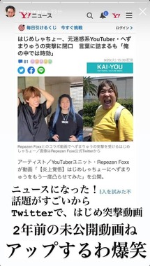 しかし、夜になると一転、ツイッターで「2年前は炎上して有名になりたくてはじめしゃちょーに凸撃した」「強く押したり深夜に家周りで叫んだり1ヶ月以上張り込み続けた」と自身の迷惑行為を明かし、「それでも許してくれた 本当に申し訳ございませんでした」と改めて謝罪。また謝罪の機会を作ったRepezen Foxxにも「ありがとう」と感謝をつづった。