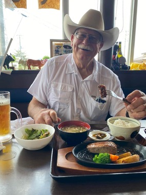 写真に映るハンセンさんはメガネを着用しており、白いカウボーイハットに半袖シャツといった装い。ステーキやライス、味噌汁、サラダといった料理を前にフォークで肉を持ち上げ、柔らかく笑っている。テーブルにはジョッキに注がれたノンアルコールビールも置かれている。
