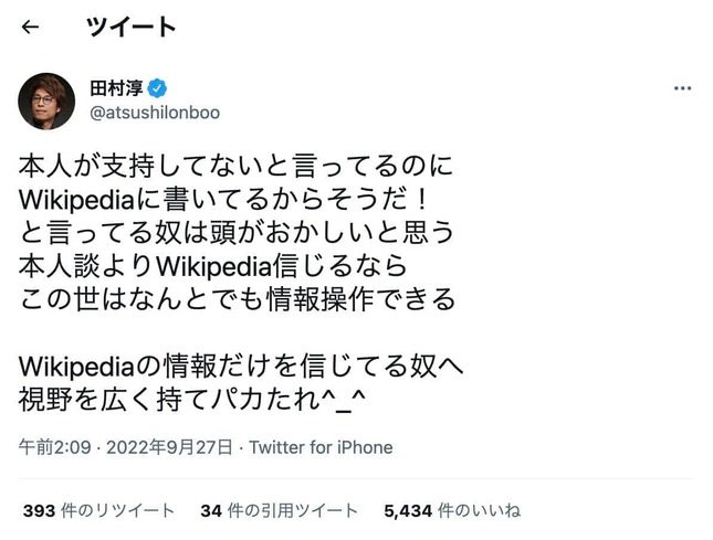 さらに27日未明には「本人が支持してないと言ってるのにWikipediaに書いてるからそうだ!と言ってる奴は頭がおかしいと思う」と投稿。下記のように述べた。