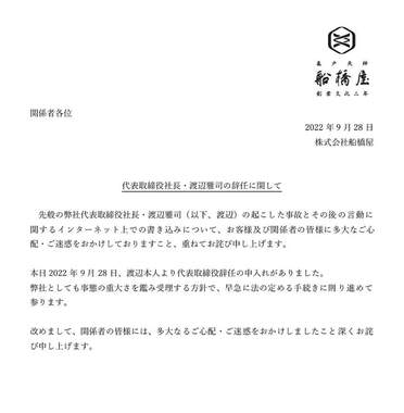 渡辺氏をめぐっては、同氏が交通事故を起こし、激突した運転手に対して罵声を浴びせ、ドアを蹴ったなどとする動画がツイッター上で拡散されていた。これを受け、船橋屋は9月27日、謝罪文を公式サイトに掲載している。