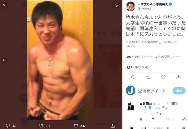 へずまさんは「猪木さん今までありがとう。大学生の頃に一番嫌いだった先輩に闘魂注入してくれた時は本当にスカっとしました」と、この日心不全のため79歳で亡くなった元プロレスラーで元参院議員のアントニオ猪木さんを追悼。猪木さんの写真と共に、大学生当時のものと思われる上半身裸で「マッチョポーズ」を決める自身のショットを公開した。