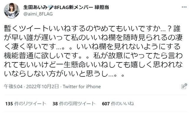 地下アイドルグループ・8FLAGの生田あいみさんが2022年10月2日にツイッターを更新し、ファンサービスの一環として行っていた、ファンのツイートに「いいね」する行為を休止することを明かした。