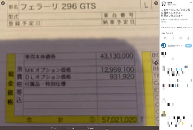 この日、迫さんは「フェラーリにオプション付け過ぎてしまった。納車楽しみだなぁ~」と「296 GTS」購入時の明細を公開した。車両本体価格は4313万円、MKオプション価格は1295万9100円、DLオプション価格は93万1920円、合計金額が5702万1020円であることが明記されている。