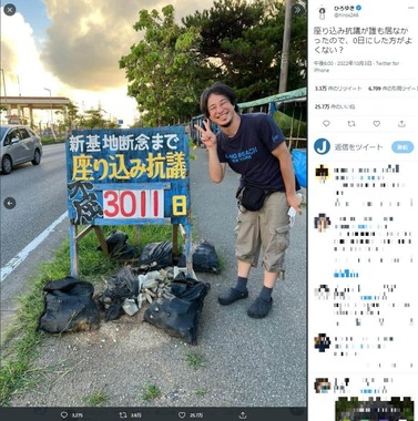 ひろゆきさんは2022年10月3日、ツイッターに2枚の写真を添え「座り込み抗議が誰も居なかったので、0日にした方がよくない?」とツイートした。写真には、「新基地断念まで座り込み抗議 不屈 3011日」と書かれた看板の横でピースサインを作り笑顔を浮かべたひろゆきさんが写っている。米軍普天間飛行場移設に伴う辺野新基地の建設現場近くで昼間撮影されたもののようだが、ひろゆきさんの他に人は写っていない。
