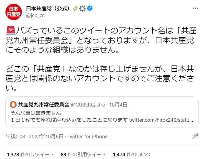 「バズっているこのツイートのアカウント名は『共産党九州常任委員会』となっておりますが、日本共産党にそのような組織はありません」