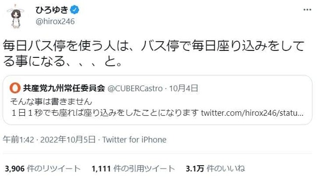 この投稿に、ひろゆきさんは「毎日バス停を使う人は、バス停で毎日座り込みをしてる事になる、、、と」と引用リツイートの形で反論。この投稿には5000件を超えるリツイート、3万件を超えるいいねが集まるなど、一連のやりとりは話題を呼んでいた。