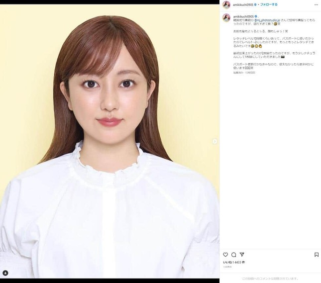 タレントの菊地亜美さんが2022年10月6日、新しく撮影したという証明写真をインスタグラムで公開した。