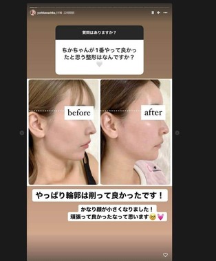ちかさんは「やっぱり輪郭は削って良かったです!」とつづり、ビフォーアフター写真を公開。ビフォー写真に比べ、アフター写真は顎まわりがすっきりとして見えており、ちかさんは