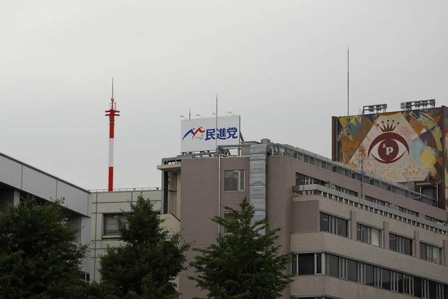 民主党時代の三宅坂ビル。屋上には大きな看板が出ていた(2015年11月撮影) -