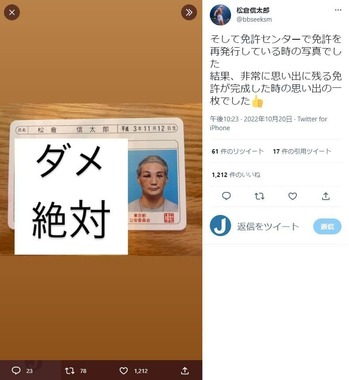 免許証の写真が公開された投稿には、ファンから「だいぶ別人ですね」「これはヤバい。笑」「期限ギリギリだったのかな もう撮るしかない的なww」といった反応や、「これで許可した免許センターも凄いです」と驚く声が寄せられている。