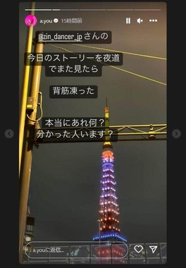 浜崎さんはストーリーズで、この日、ZINさんのストーリーズを夜道で見たことを告白。「背筋凍った」と訴え、「本当にあれ何? 分かった人います?」と呼びかけた。
