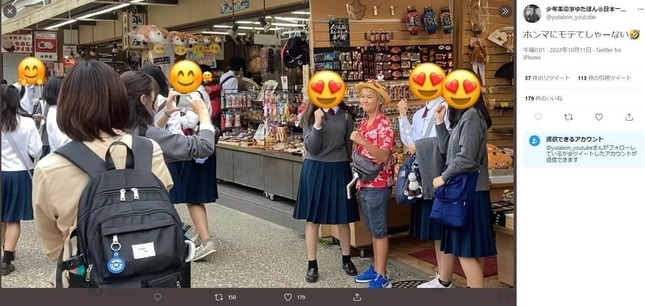 ゆたぼんさんは11日にもツイッターで、「ホンマにモテてしゃーない」のコメントと共に修学旅行生の写真撮影に応じる様子を公開。今回の動画は、この写真を撮影した際のもののようだ。