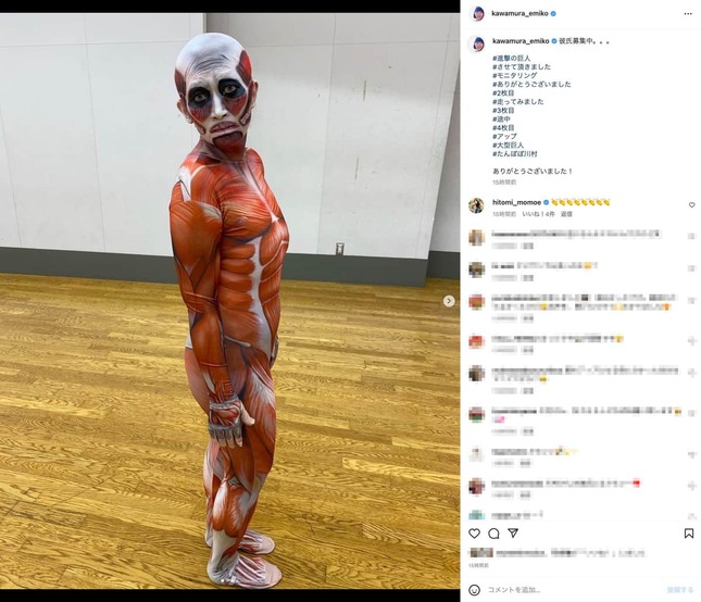 お笑いコンビ・たんぽぽの川村エミコさんが2022年11月3日、人気漫画「進撃の巨人」に登場するキャラクター「超大型巨人」に扮したコスプレ姿をインスタグラムで披露した。投稿にはファンから「軽くホラー笑」といった声が集まっている。