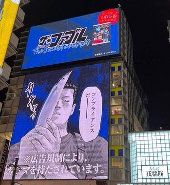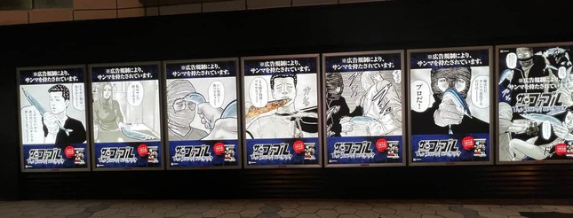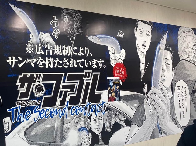 広告はツイッターで拡散され、「広告規制を逆手に取った手法。オモロい」「秋刀魚てwwww」「ファブルの広告めっちゃいい」「さすがプロやな───」と楽しむ声が寄せられている。担当編集・タサカ兄さん(@tinpozaru)のツイートによると掲出期間は11日までだ。