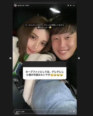その後、カープファンからの「デレデレした顔の写真みたいです」というリクエストに対し、「え~なんかいつもデレデレした笑顔してるから難しかった~」と、ふたり笑顔のツーショット写真もアップし、ラブラブな様子を見せていた。