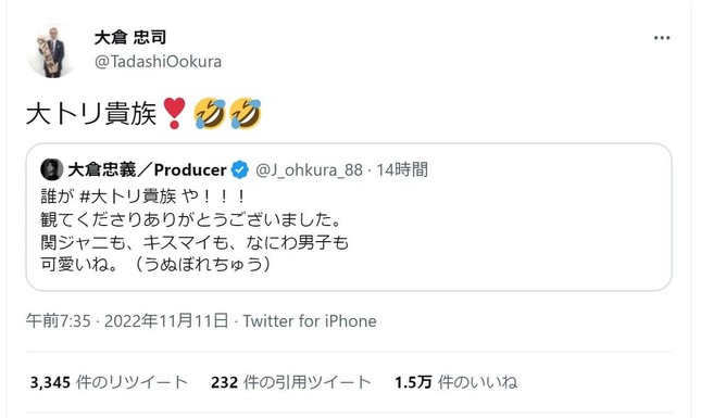 2022年11月10日放送の音楽特番で関ジャニ∞が「大トリ」を務めたことから、ツイッター上で「大トリ貴族」というワードが拡散。これに忠義さんが「誰が大トリ貴族や!!!」とツッコミを入れ、それに忠司氏が反応した。