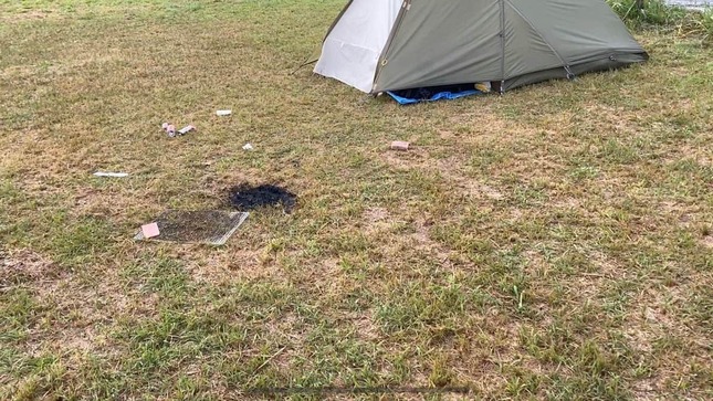 芝生のキャンプ場で撮影された添付写真を見ると、1張りのテントの周りに空き缶などのゴミが散乱している。焼き網も転がっており、近くの芝生が網より一回り小さい範囲で真っ黒に焦げている様子が目を引く。