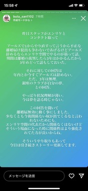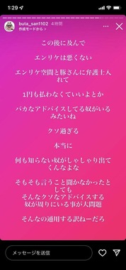 元No.1キャバクラ嬢で実業家のエンリケさんの元夫「ブタ」さんが2022年11月17日から18日にかけ、インスタグラムのストーリーズを複数投稿し、提出された離婚届は無効だとして争うことを宣言した。