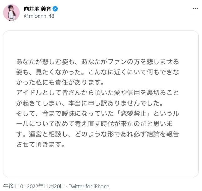 向井地さんは2022年11月20日、ツイッターで「アイドルとして皆さんから頂いた愛や信用を裏切ることが起きてしまい、本当に申し訳ありませんでした。そして、今まで曖昧になっていた『恋愛禁止』というルールについて改めて考え直す時代が来たのだと思います。運営と相談し、どのような形であれ必ず結論を報告させて頂きます」と投稿した。AKB48をめぐっては19日、文春オンラインが岡田奈々さんの熱愛を報道していた。