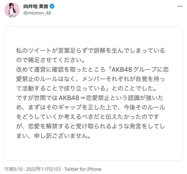 向井地さんは21日に「改めて運営に確認を取ったところ『AKB48グループに恋愛禁止のルールはなく、メンバーそれぞれが自覚を持って活動することで成り立っている』とのことでした」と報告。恋愛禁止ルールについて「世間ではAKB48=恋愛禁止という認識が強いため、まずはそのギャップを正した上で、今後そのルールをどうしていくか考えるべきだと伝えたかったのですが、恋愛を解禁すると受け取られるような発言をしてしまい、申し訳ございません」ともつづっている。