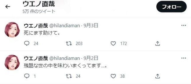 ウエノさん本人からのツイッターでの発信は、9月3日に投稿された「死にます助けて。」が最後だった。このツイートには、「謹んで御冥福をお祈り申し上げます」「ご冥福をお祈りします」「お世話になりました」など、ファンからの追悼メッセージが相次いでいる。