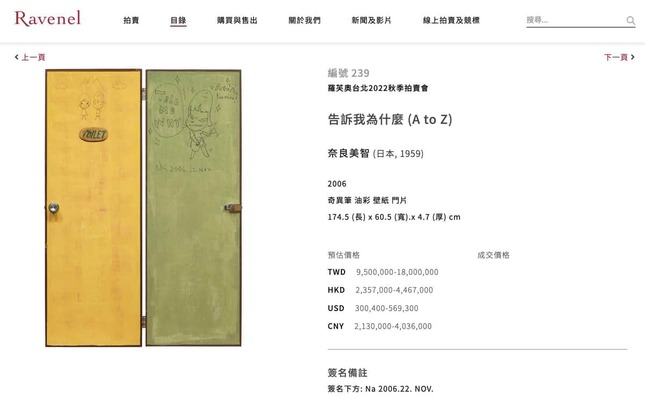 と考えを述べる。ファンから美術館に寄贈してほしかったという声が寄せられると、奈良さんは「大金が欲しいだけなんだと思います。せめて連絡くれたならとか思うけど」と応じる。扉が出品されるオークションハウス・ラベネル台北のサイトによると、開催は12月4日、見積もり価格は約30万〜56万ドルだという(22日時点)。