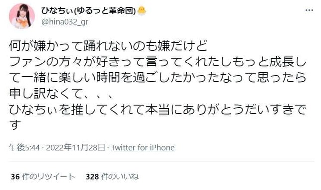ダンスができないことについて、「何が嫌かって踊れないのも嫌だけど ファンの方々が好きって言ってくれたしもっと成長して一緒に楽しい時間を過ごしたかったなって思ったら申し訳なくて、、、」と苦しい胸中をつづり、「ひなちぃを推してくれて本当にありがとうだいすきです」とファンへの感謝を述べた。