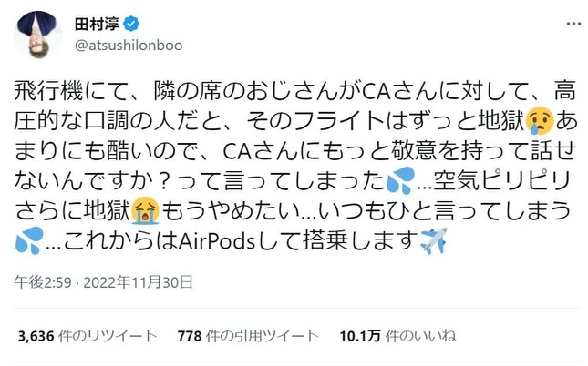 田村さんは「飛行機にて、隣の席のおじさんがCAさんに対して、高圧的な口調の人だと、そのフライトはずっと地獄」と書き出し、「あまりにも酷いので、CAさんにもっと敬意を持って話せないんですか?って言ってしまった」とその乗客に苦言を呈したと明かした。すると「...空気ピリピリさらに地獄」と不穏な雰囲気に。「もうやめたい...いつもひと言ってしまう...」(原文ママ)と後悔したようで、「...これからはAirPodsして搭乗します」と締めくくった。