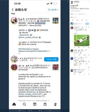 亜土夢選手は2日の日本戦後、ツイッターで自身のインスタグラムの「お知らせ」欄のスクリーンショットを投稿。そこには、W杯の碧選手のゴールをめぐり亜土夢選手のアカウントを紐づけて投稿するユーザーや、亜土夢選手のアカウントを新たにフォローするユーザーなど、通知がひっきりなしに来ている様子が記されていた。