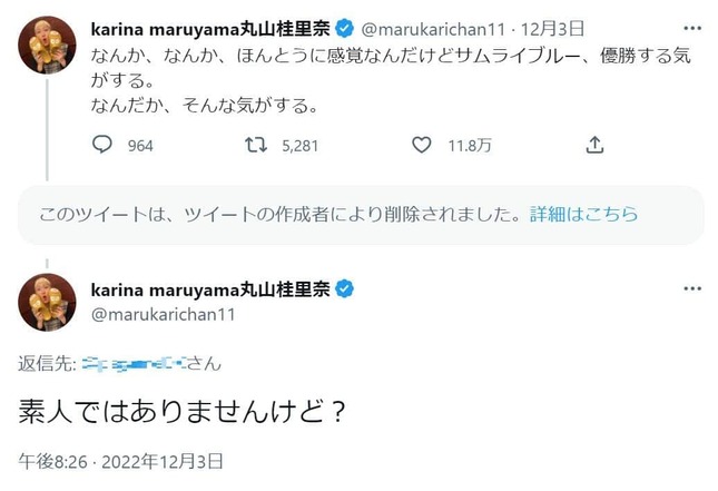 発端となったのは、丸山さんの2022年12月3日のツイート。この前日、日本代表は強豪・スペインに勝利し、グループステージ2勝1敗で決勝トーナメントへ1位通過した。丸山さんは「なんか、なんか、ほんとうに感覚なんだけどサムライブルー、優勝する気がする」「なんだか、そんな気がする」と力強くつづっていた。