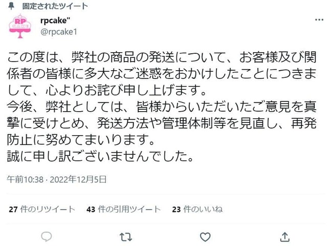 リプスは2022年12月5日、RPcakeの公式ツイッターで謝罪した。