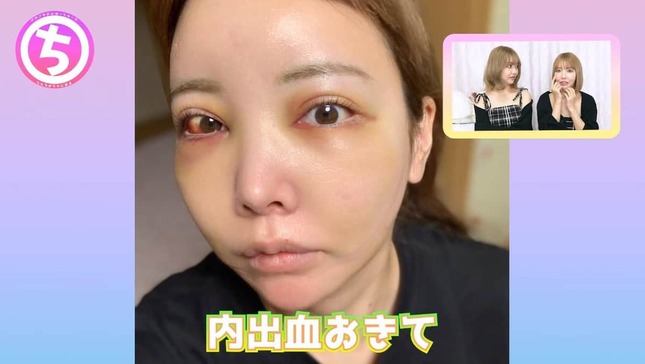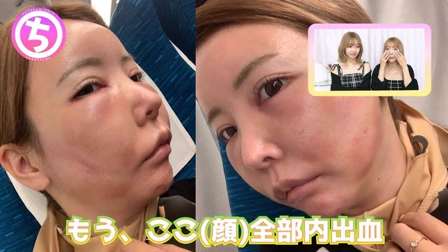 ダウンタイムが苦になった原因として、ちかさんは「まず内出血。出ますよと言われてたけど、もうここ(顔)全部内出血して、しまいには眼球の中まで内出血おきて、目も全然開かないし...」と当時の写真を掲載。食事や痛みなどの問題はないが「腫れがレベチにきつかった」と話していた。