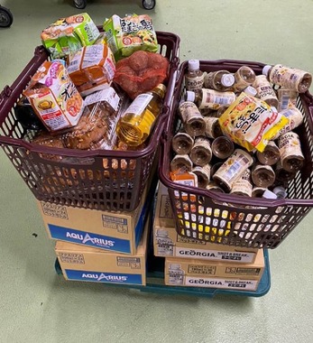 2つのカゴには、ペットボトルのコーヒーがギッシリ詰まり、味噌やサトイモのようなもの、スープと様々な食材も見える。
